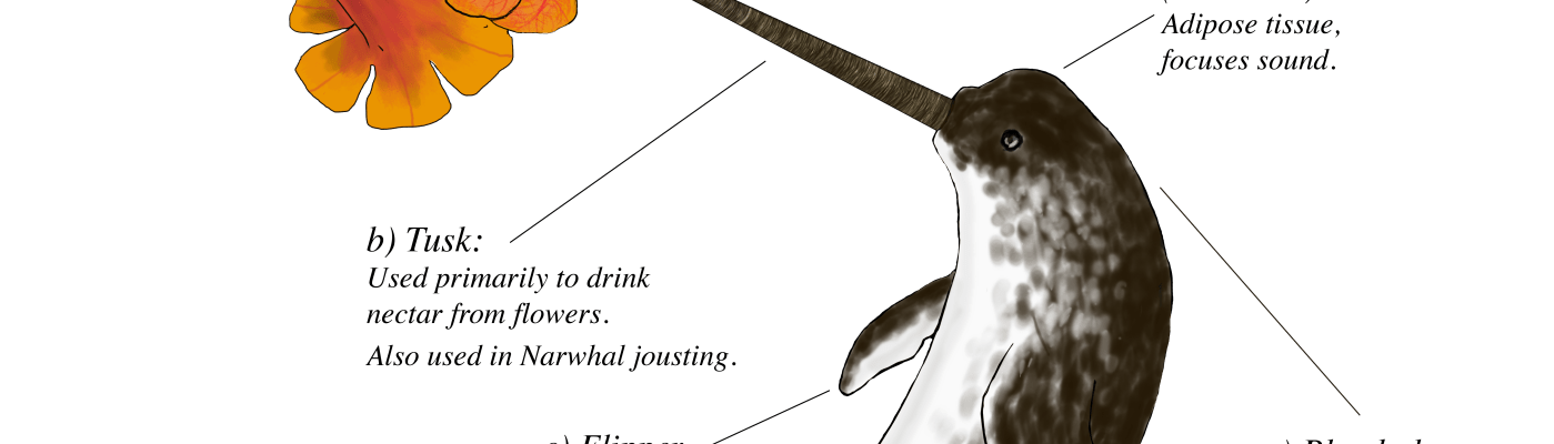 Some years ago, I had this idea in my head to make scientific illustrations that are jokingly inaccurate. The first idea I came up with was a narwhal drinking from a flower like a hummingbird, but I just never got around to making it happen until this week.