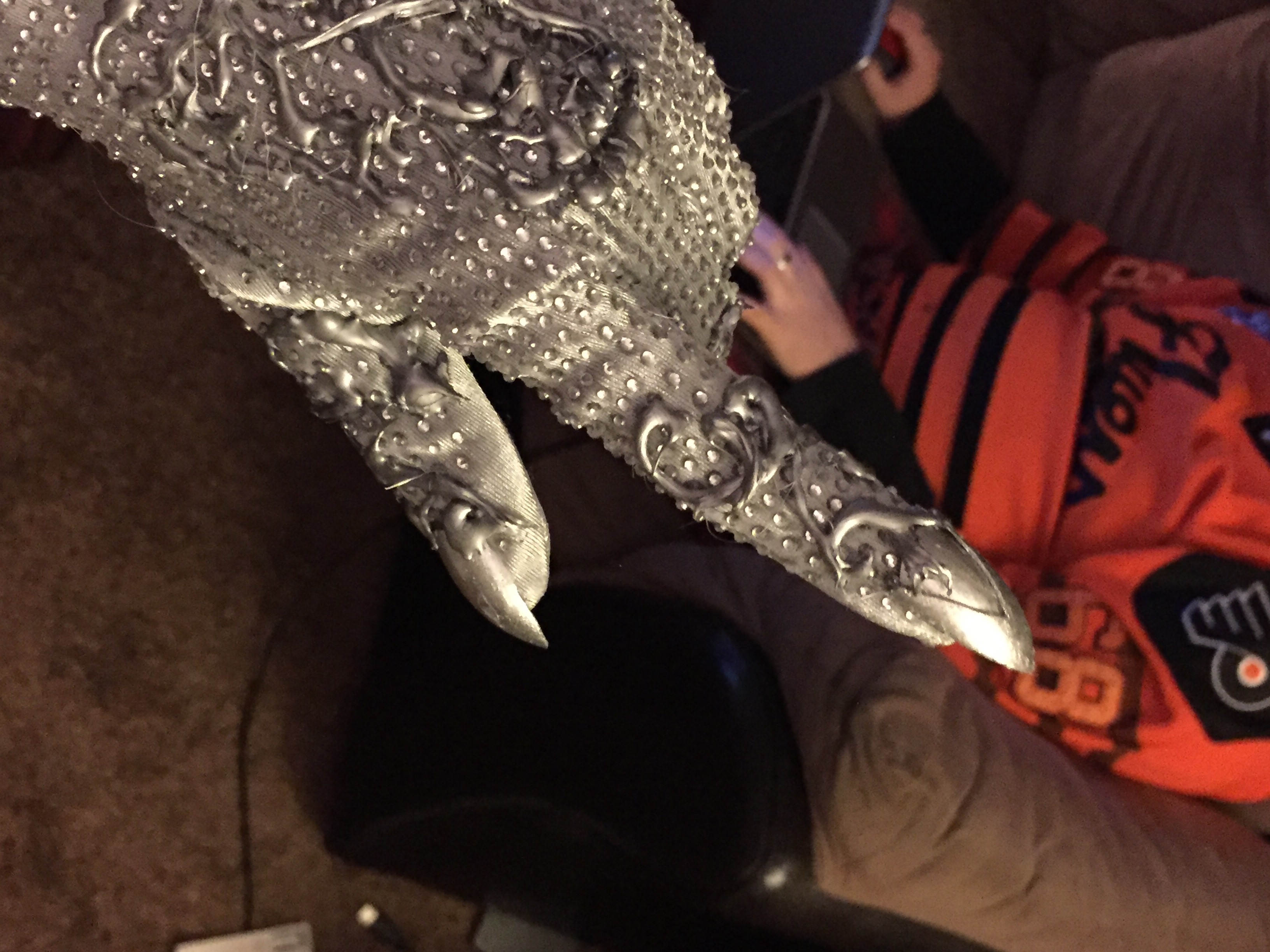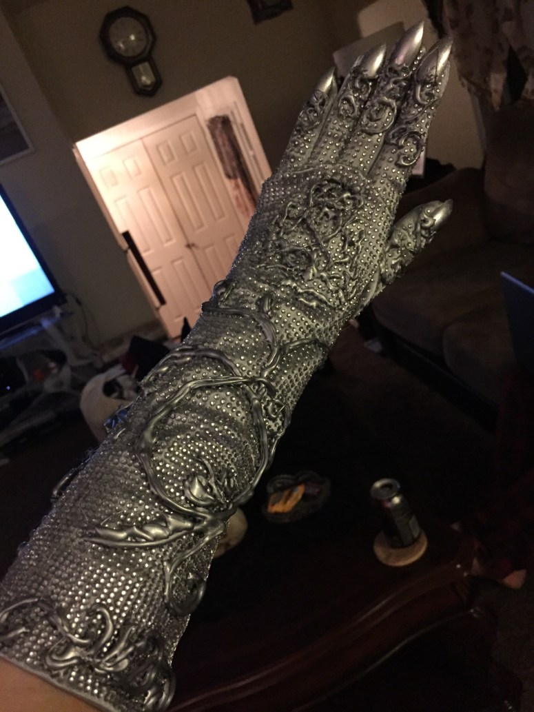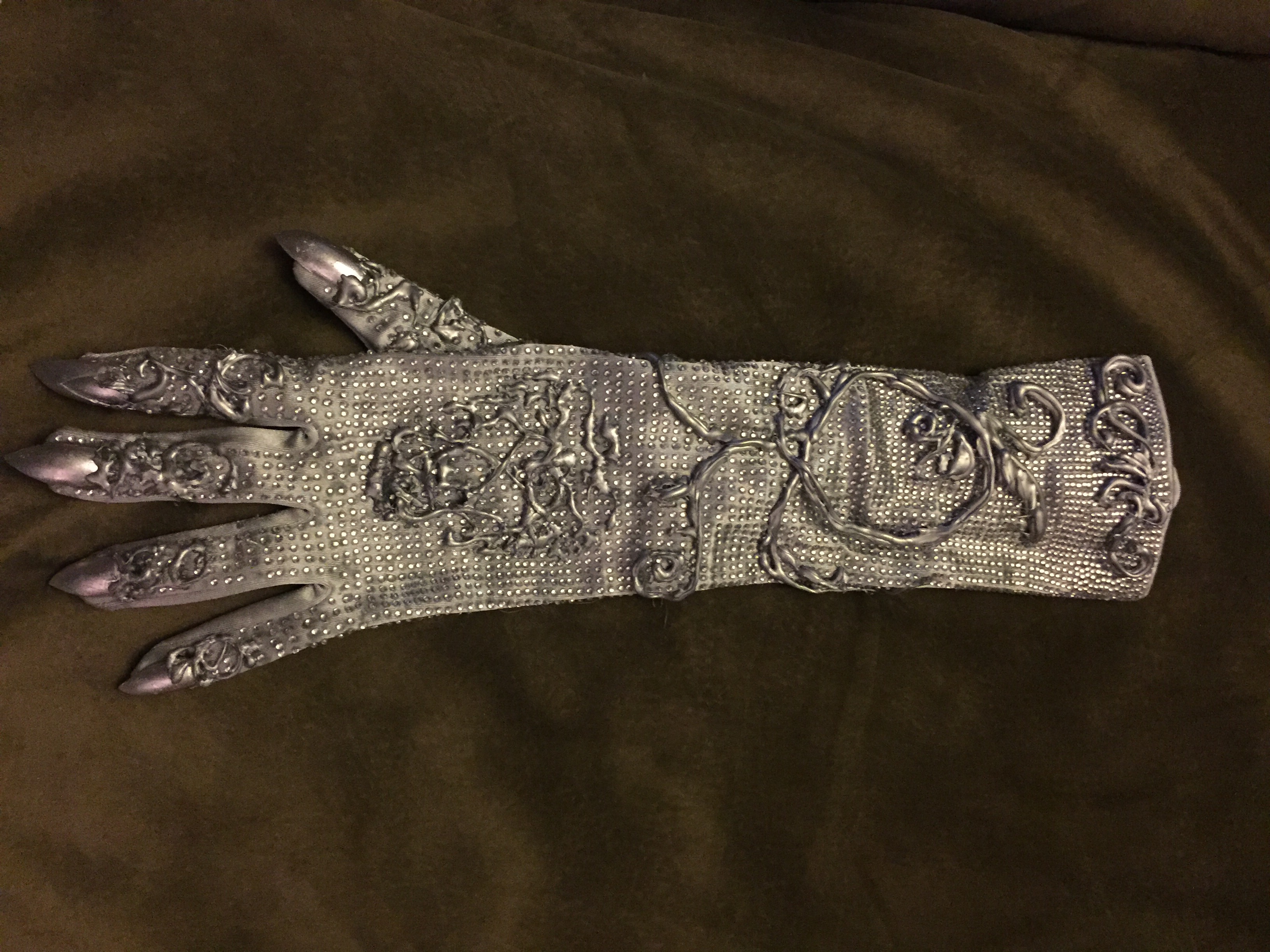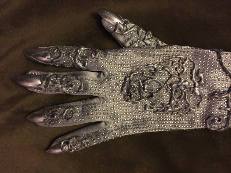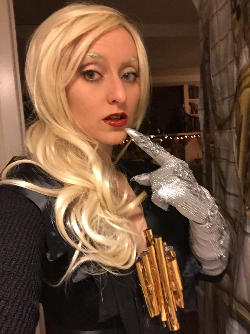 For Halloween this year, I decided to be the Countess from American Horror Story Hotel, played by Lady Gaga. The bulk of my work on this costume went to her infamous hunting glove. The real one, designed by Michael Schmidt, is covered in thousands of Swarovski crystals. I certainly don’t have that kind of budget, so I ordered thousands of manicure rhinestones and a silver glove, and went to work with some gem glue and a pair of tweezers. This took many, many hours, a lot of coffee/tea, and a great deal of binge-watching Peaky Blinders.