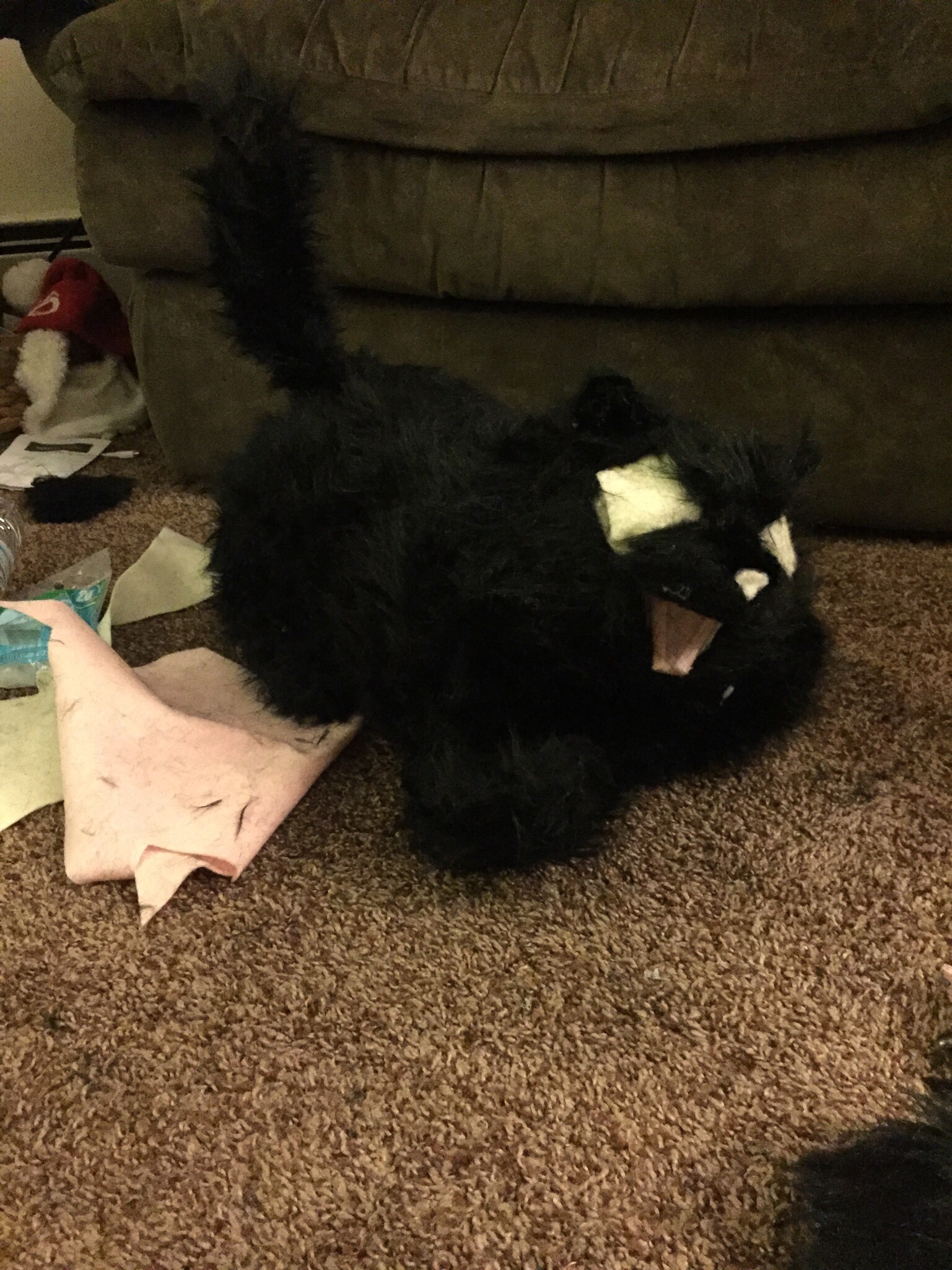 Recently, my good friend Gina sent me a message which read, “Is there any chance you’d be willing or able to make a stuffed animal that essentially looks like a dead cat?” The dead cat in question was to be used in a production of The Murder Room by Jack Sharkey at the Village Players of Hatboro. After some thought, I agreed to do it! In the play, a murder mystery comedy, the cat dies after drinking poisoned cocoa meant for someone else. I wanted to make the cat look… dead, but also absurd enough to be funny. I set to work with some floral wire, felt, hot glue, clay, faux fur, paint, Mod Podge, and fake nails left over from my Countess glove.
