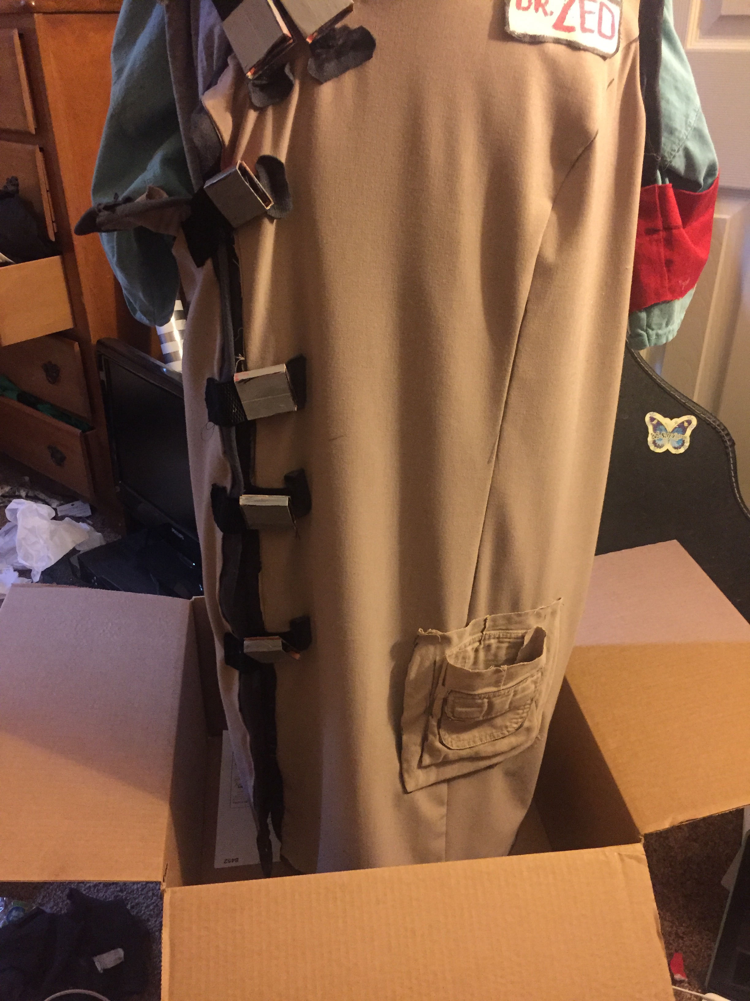 I made it from two shirts, a tan sheath dress, some old khaki shorts, and some leggings that, despite a large hole in the crotch, I just refused to retire- until I needed them for the trim on this costume, anyway.
