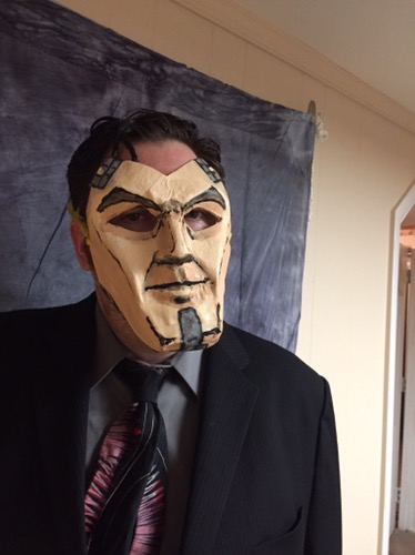 Spooky!!I ran the mask under water to dampen it, and molded it with my fingers. I added some medical cloth tape and paper to make a chin and a more squared off jawline, made a few cuts here and there, and slapped some paint on it and a ribbon to keep it on Rick’s head. It took about 2 hours. With more time, I could make a better mask, but it served its purpose. Rick had a cool mask for the party.